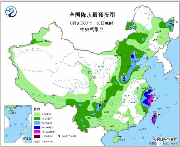 预计,9日08时至10日08时,黑龙江东部、华北东部、河南北部、江南东部、四川盆地南部、台湾岛等地的部分地区有大到暴雨,其中浙江东部、台湾岛的部分地区有大暴雨,局地特大暴雨。10日08时至11日08时,华北东部、黄淮中东部、江淮东部、江南东部等地部分地区有大到暴雨,其中山东半岛东南部、江苏南部、浙江东部等部分地区有大暴雨,浙江东部、山东半岛东南部沿海局地特大暴雨。