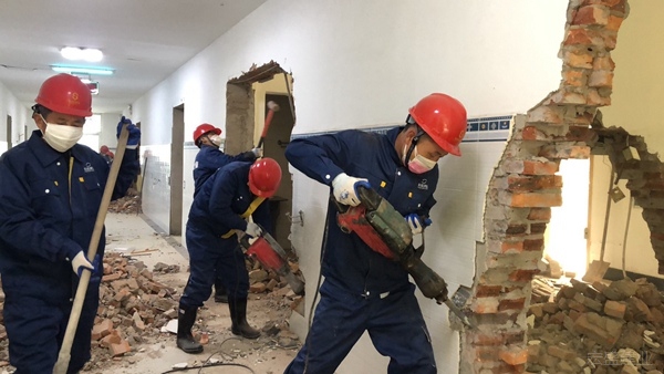 1月27日,大年初三早上8时整,一支由宏盛建业60多名专业管理和施工人员组成的施工队伍,准时到达上饶市第二人民医院,全面展开拆建施工。