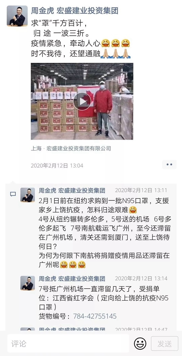从国外起运到抵达国内,董事长周金虎始终关注这批物质的动态。物资于7日由南航运至广州后,便滞留在广州机场。由于滞留时间较久,董事长周金虎心急如焚,多次联系南航,并通过微信朋友圈等方式向各方求助。