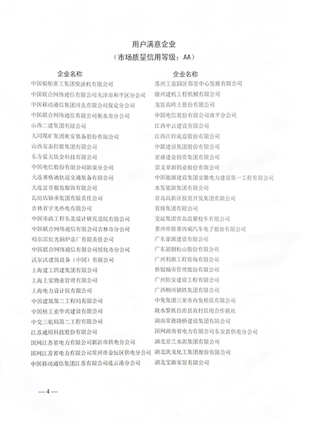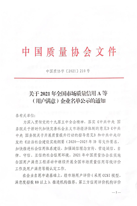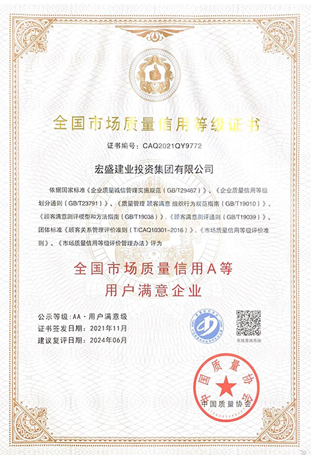 2021年中国质量协会在实施全国用户满意工程活动中继续开展全国市场质量信用等级评价工作及用户满意等级认定工作。宏盛建业投资集团有限公司作为建筑施工特级企业,继先后获得“全国建筑业AAA级信用企业、江西省守合同重信用企业”等荣誉称号后,于2021年11月再次荣耀获评“2021年全国市场质量信用A等·用户满意企业”。