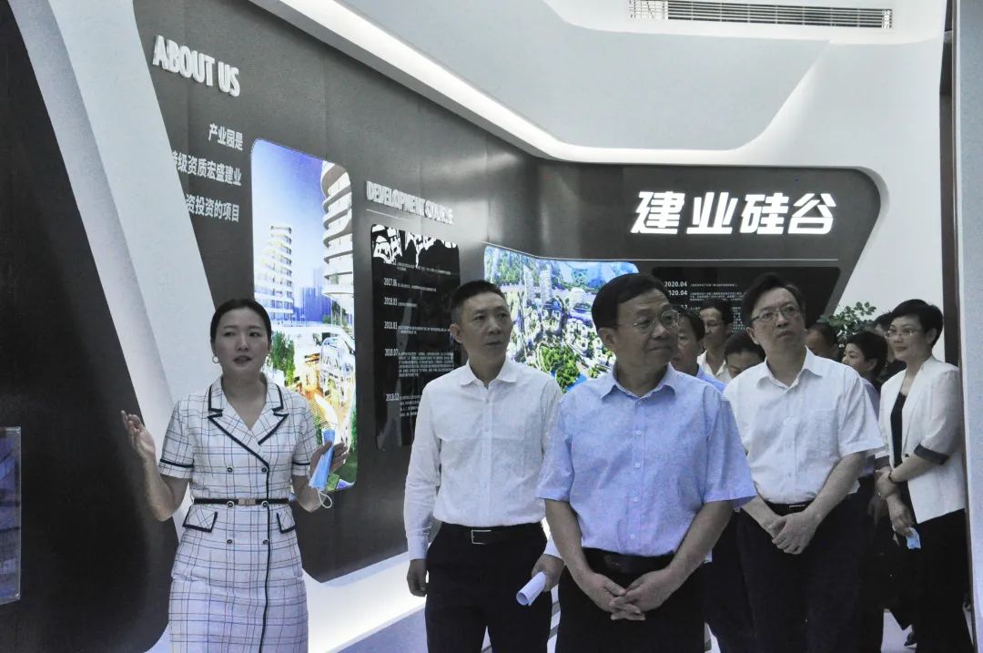 在建业硅谷总部经济园展厅,上饶市建筑科技产业园投资管理有限公司董事长周金虎,向刘强主席简要汇报了建筑科技产业园项目自落户上饶以来得到的政府支持以及所取得的成绩,并陪同观看了宣传视频和展墙上相关板块的介绍。