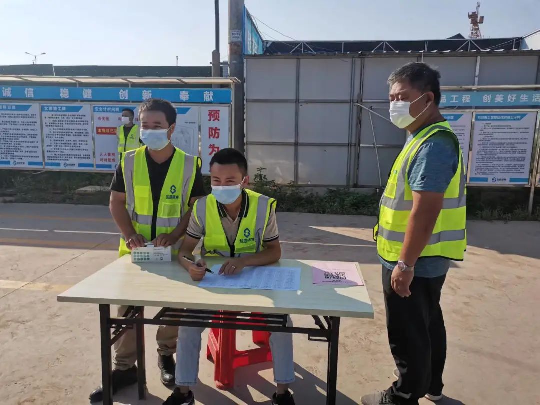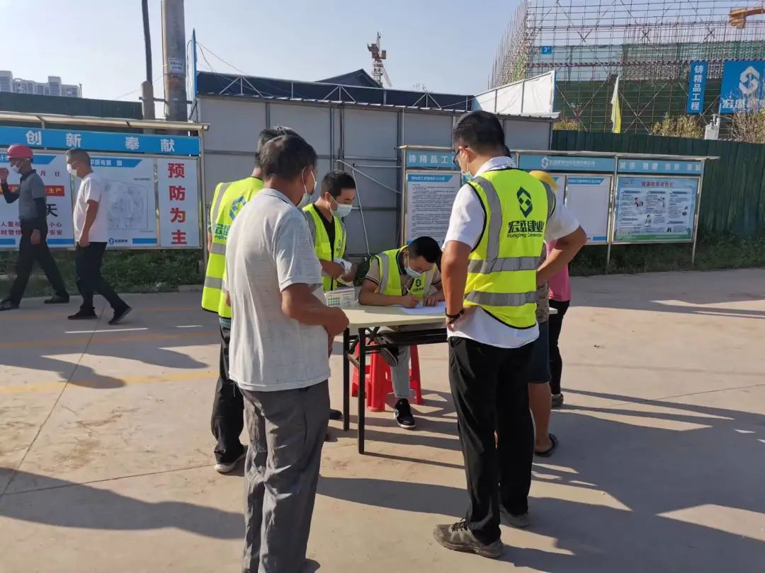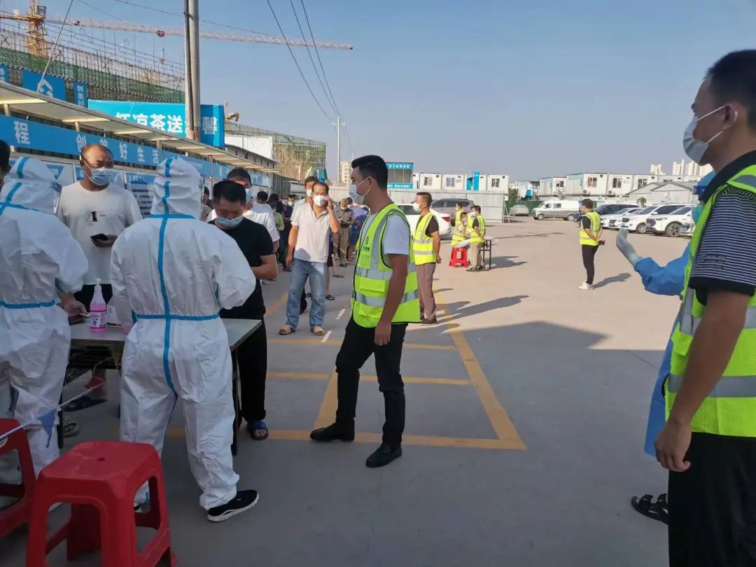 项目现场设置多个核酸检测点,提醒需要采集的工人佩戴口罩、保持距离,点位落实消杀,妥善处理医废。