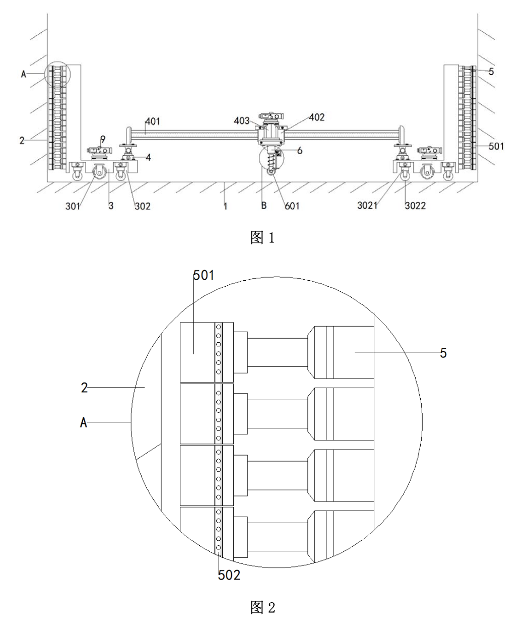 在建筑进行全面投入建设之前,需要对建筑的一系列指标进行检测,检测过关之后才能进一步的开展对建筑的建设工作,其中的检测工作就包括对房间内地面与墙面的平坦度的测量工作,因此需要一种便于调节的建筑用测量装置。本实用新型中,通过设置水平调节结构,通过使电动伸缩杆A、刹车脚轮与水平仪之间配合使用,可以对装置与水平面之间调节平行,方便对后续测量工作进行开展。
