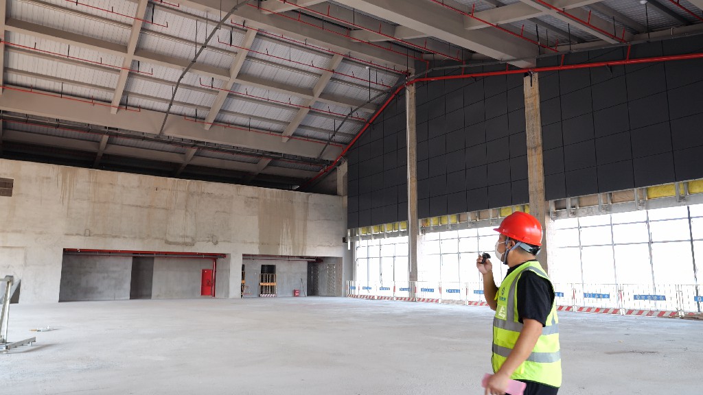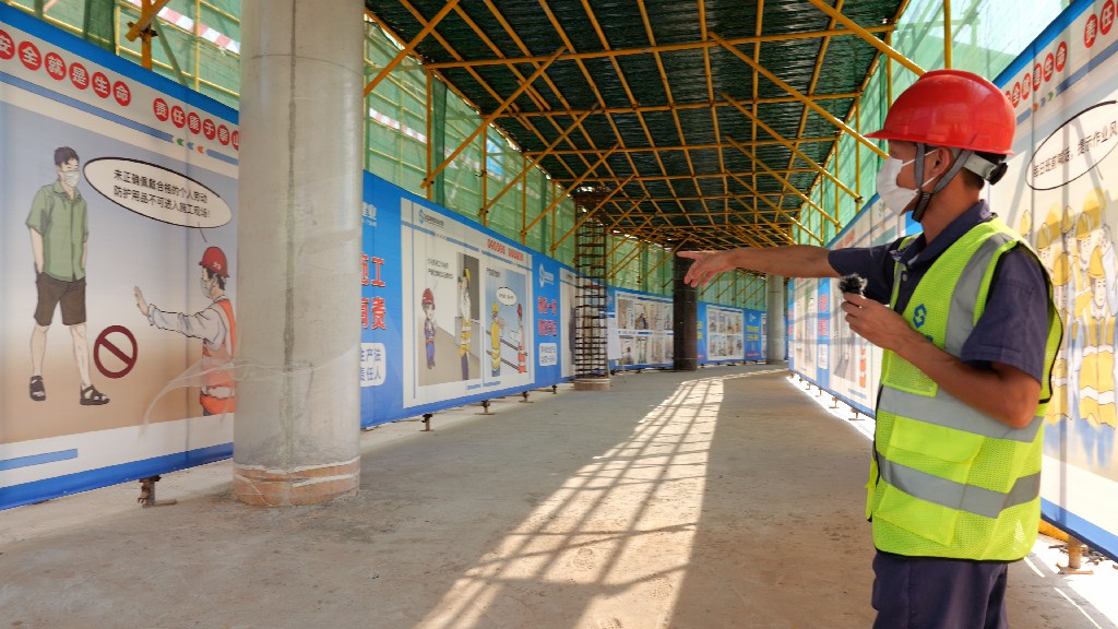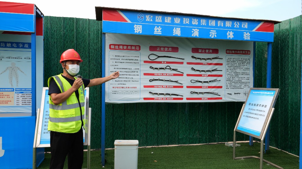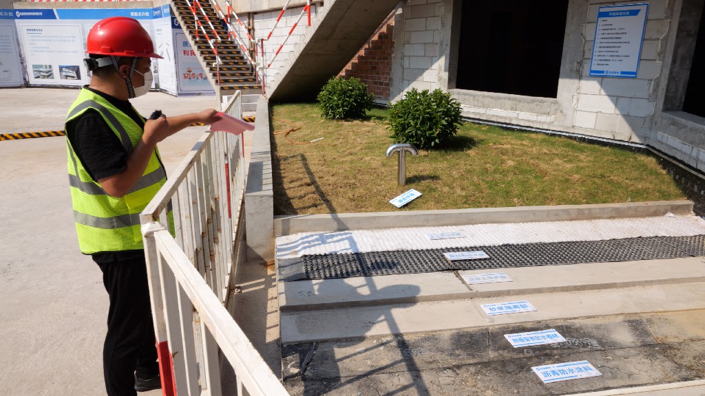 随后,由引导员以在线直播的形式带领大家参观本次观摩会现场。观摩线路沿途布设党建长廊、标准养护室、智慧工地展区、实体样板区、圆柱工艺展区、施工机具及新工艺材料展示等。观摩过程中,引导员为大家详细介绍了赣州经济技术开发区文化艺术中心(A、C地块)建设项目中的亮点技术:弧形木模、BIM管综调整、弧形梁GPS坐标定点放样、种植层面防水施工……