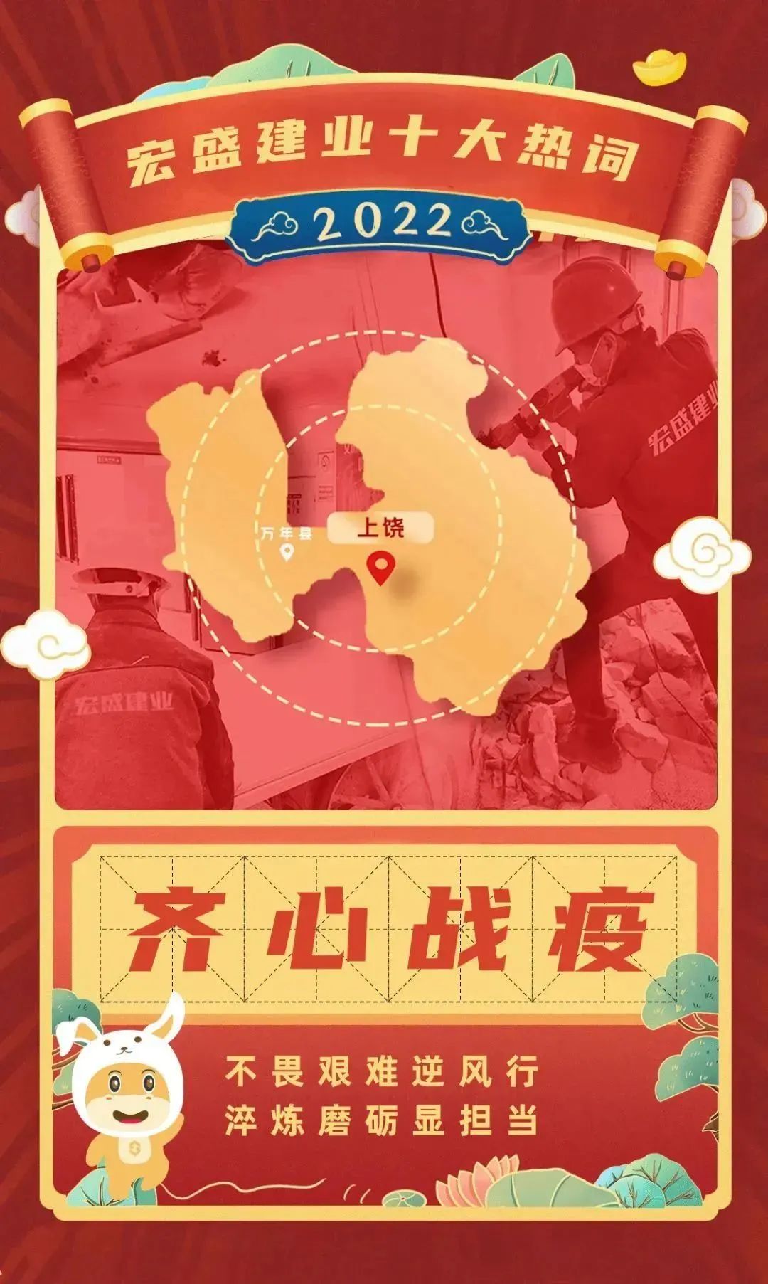 这一年,在抗击新冠肺炎疫情的斗争中,广大宏盛人挺身而出,参建万年方舱医院,投身抗击疫情的前线。他们以坚定果敢的勇气和坚韧不拔的决心,同时间赛跑,与病魔较量,展现了宏盛人面对生死考验时坚守岗位、不畏艰险的优良品质。