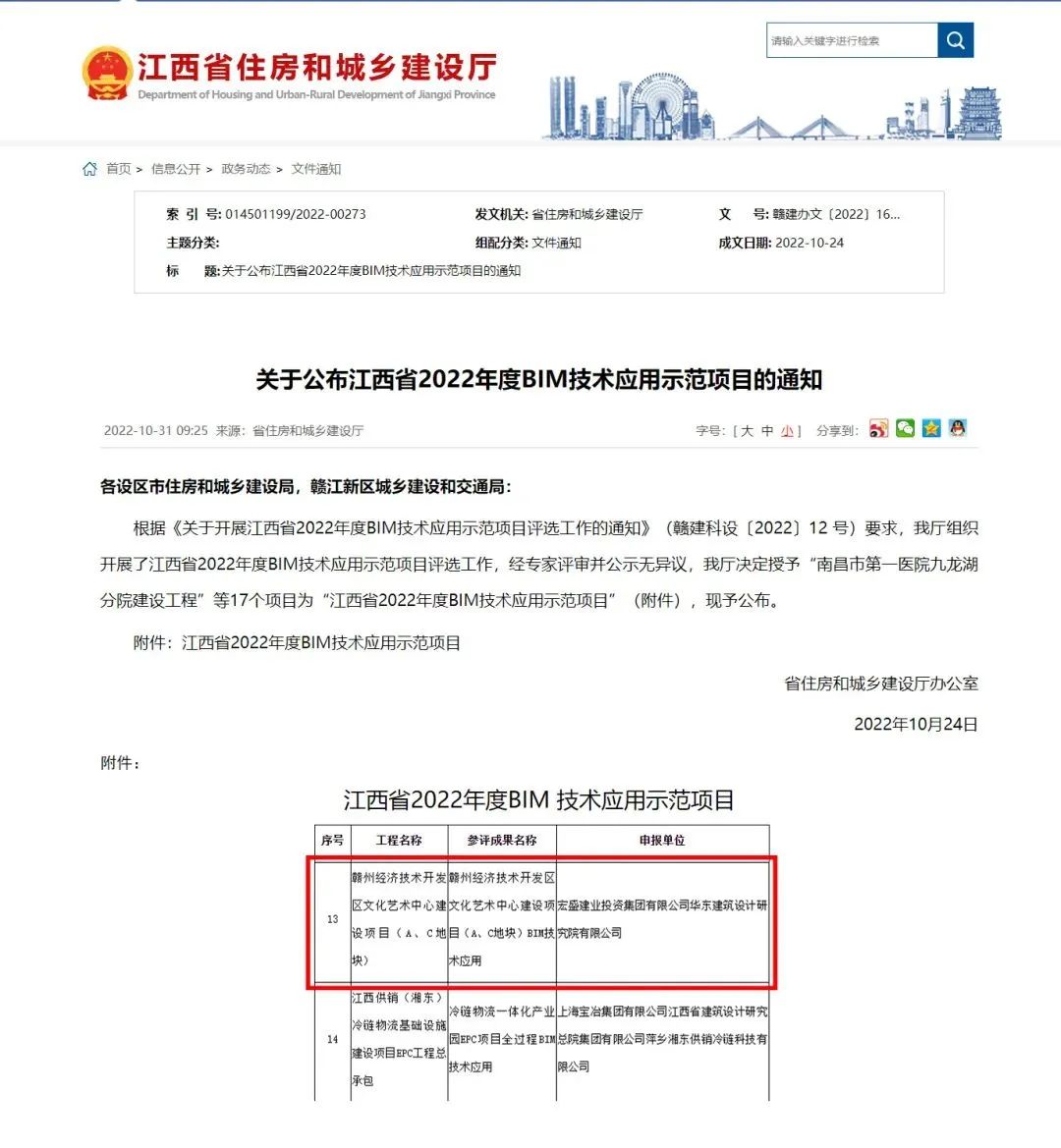 宏盛建业投资集团有限公司赣州经济技术开发区文化艺术中心建设项目(A、C地块)荣获江西省2022年度BIM技术应用示范项目。