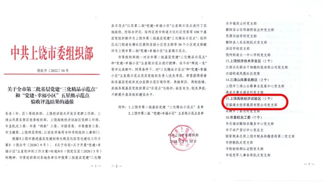 宏盛建业投资集团党支部获评上饶市第二批基层“三化精品示范点”荣誉称号。这是上级党组织对集团党建工作的高度肯定,渗透着全体党员的辛勤付出和努力,更是对下一步党建工作的鞭策和鼓励。