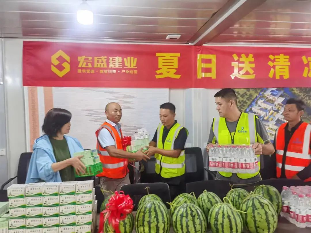 时值盛夏,骄阳似火,热浪袭人,宏盛集团杜甫中学项目部的一线员工依然不惧烈日骄阳,坚守工作岗位,赶工期,抢进度,为确保项目质量安全等各项工作有序开展。7月4日,宏盛集团杜甫中学项目部项目负责人龙昌荣代表集团给项目上的一线员工送去防暑降温物品,并深切慰问宏盛建设者们,带去集团领导的深切关怀。