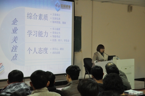 讲座首先播放集团宣传片,随后张经理从企业的角度,阐述施工企业尤其是民营企业对招聘应届生的要求,她从综合素质、学习能力、职业心态三方面入手,希望同学们锤炼勤学苦练、吃苦耐劳的精神,学会适应施工企业文化和建筑行业特性。同时她还引用实例为提供同学们职业发展的建议。最后,她还在现场发布了集团2015年招聘计划,希望有更多大学生加入宏盛大家庭。