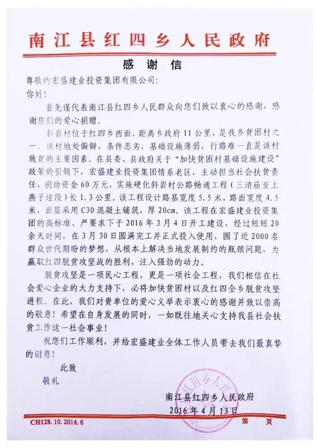 近日,集团公司红鱼洞项目部收到一封来自南江县红四乡乡政府写的感谢信。信中表达了近2000名红四乡村民对集团公司济困扶贫的感激之情。
