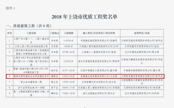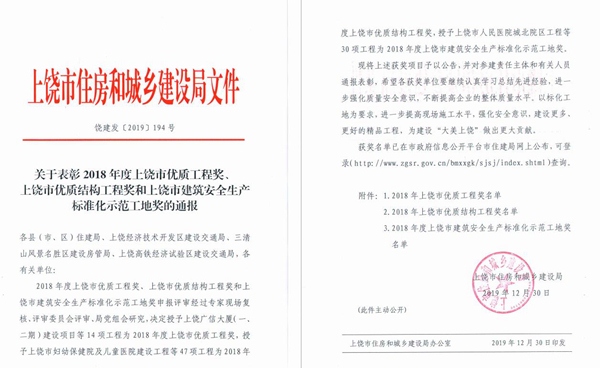 近日,从上饶市住建局文件(饶建发﹝2019﹞194号)获悉,上饶市住房和城乡建设局对上饶市优质工程进行表彰通报,宏盛建业承建的三项优质工程受到表彰。