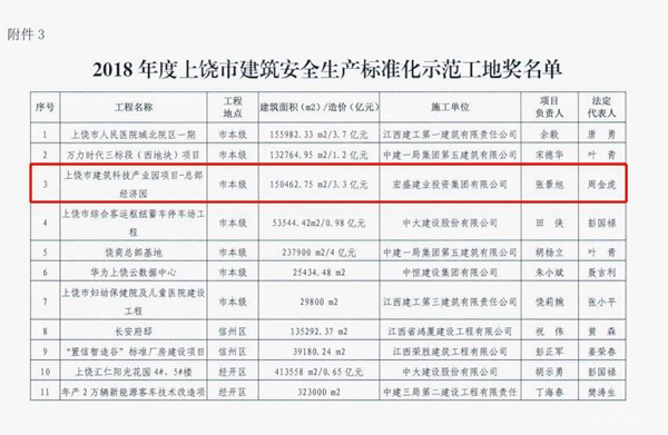 据了解,本次共通报表彰了2018年度上饶市优质工程奖14项,2018年度上饶市优质结构工程奖47项,2018年度上饶市建筑安全生产标准化示范工地奖30项。