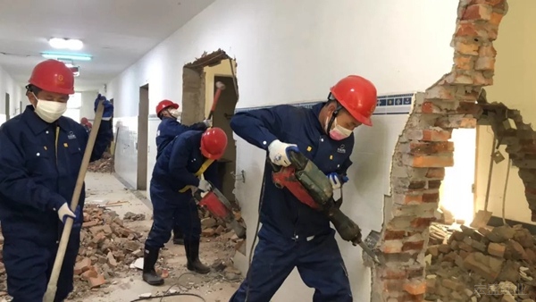 为加快上饶市第二人民医院负压病房建设,由宏盛建业投资集团60多名现场管理和施工人员组成的施工队伍,加班加点,连续奋战30多小时,截止1月28日16时,已基本完成墙体凿除任务,现正在进行拆除物清运工作。