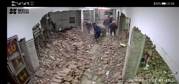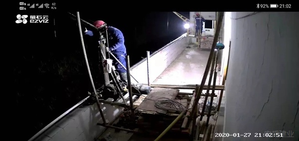 1月27日晚21时,施工队伍依然忙碌着进行监控安装和现场清运。