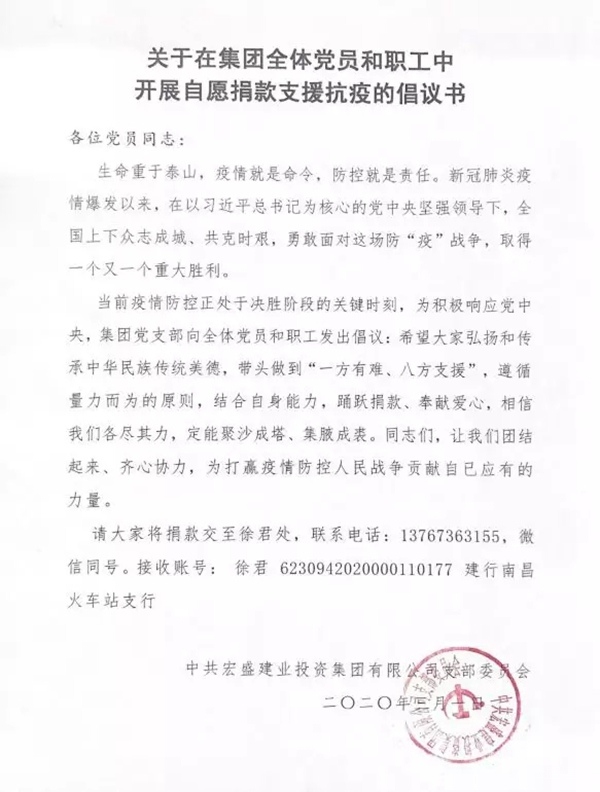 “抗击疫情当先锋,身体力行作表率”。在疫情面前,以集团董事长周金虎、副董事长周金旺同志为代表的一大批共产党员,挺身而出,力求作为,截止目前,宏盛建业已从全国和海外采购了价值340多万元的医疗防护物资,用于无偿捐赠,为上饶市、新余市、宜春市、宜宾市、巴中市、四川凉山州,上海等市辖区的相关单位抗疫出力,出资近百万元无偿援建上饶市负压病房和医疗废物暂存站2个抗疫项目。