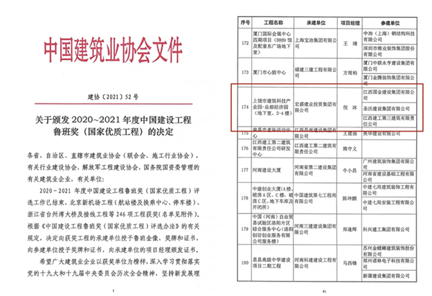 近日,中国建筑业协会传来喜讯,上饶市建筑科技产业园——总部经济园(地下室、2-4楼)项目荣获2020~2021年度中国建设工程鲁班奖(国家优质工程),这是古来豫章第一门户——上饶市的“首个”鲁班奖工程,无疑是为实现上饶市的快速发展和经济腾飞插上双翼,更是一份属于全上饶市人民的喜悦和骄傲!