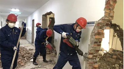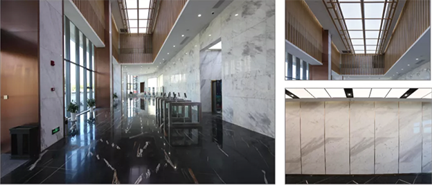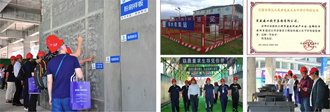 在材料方面,严格执行验收制度,对于各种质量难题,项目部特别成立QC攻关小组进行专门攻关,通过开展QC质量小组活动,解决了粉刷质量通病防治、不规则部位内外脚手架搭设、外轮廓尺寸控制等多项本工程的质量难点,为创鲁班打下坚实基础。装修施工期间特别制定完善的成品保护机制以减少损失和污染,同时也为上饶市创国家卫生城市工作保驾护航。为积极响应国家政策,积极践行绿色施工,项目采用了多种“四节一环保”措施,例如扬尘控制、永临结合等,还使用了多种节能设施。自主研发使用的建筑垃圾垂直运输系统,具有便于拆装、重复周转、节材环保,限制扬尘和使用安全的特点,产品及工艺获得了《一种用于施工过程的安全环保限尘系统》(ZL 2018104728730)和《一种用于施工现场建筑垃圾收集装置》(ZL 2018104727475)两项发明专利授权;经科技成果鉴定认定其技术已达到国内领先水平;其施工工艺获批江西省省级工法《建筑垃圾垂直输送系统的施工工法》(赣建建[2020]4号)。绿色施工成果得到我省建筑业协会和中国建筑业协会的认可;由中建协主办,本项目施工单位协办,在本项目现场召开了江西省首次全国级别的绿色施工交流会。