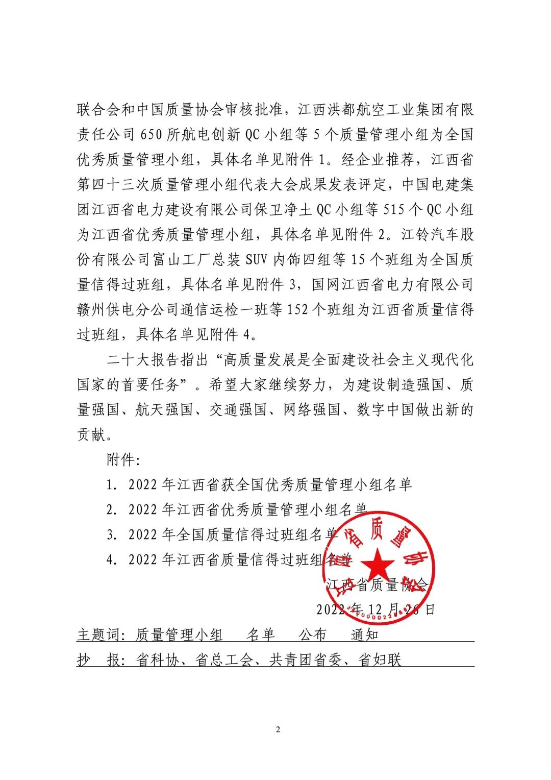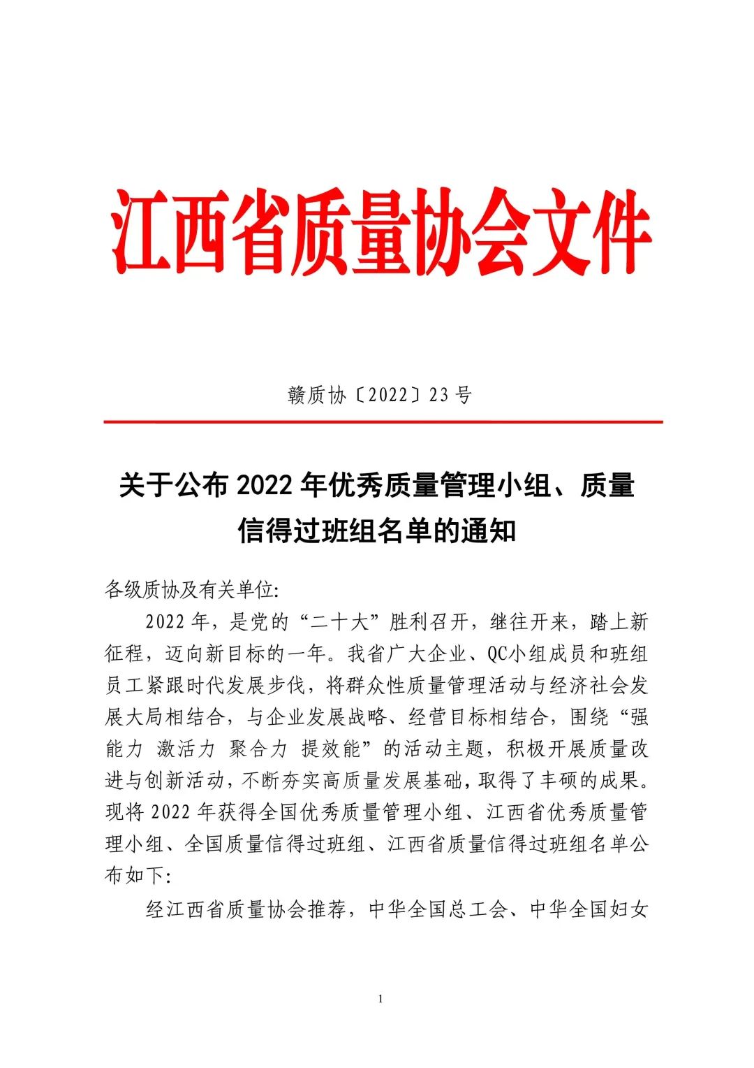 近日,江西省质量协会赣质协〔2022〕23号文件中公布2022年优秀质量管理小组、质量信得过班组名单,宏盛建业9组QC小组荣获2022年江西省优秀质量管理小组荣誉称号。