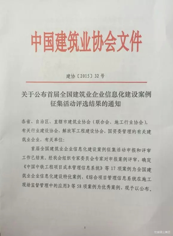 近日,由中国建筑业协会举办的全国建筑业企业信息化建设案例评选结果出炉,集团自主研发的建筑施工企业综合信息管理平台获评特优案例。据了解,此次信息化案例评选共评出17项特优案例,58项优秀案例。